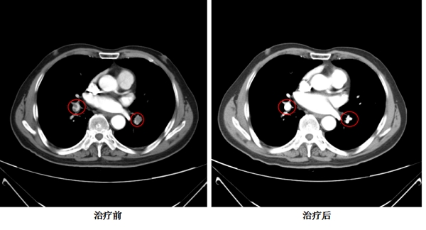 1月后,患者复查胸部增强CT提示原肺动脉内栓子基本消失,右下肢血管彩超提示腘静脉血栓伴部分管腔再通,目前病情稳定,顺利完成两程全身化疗。