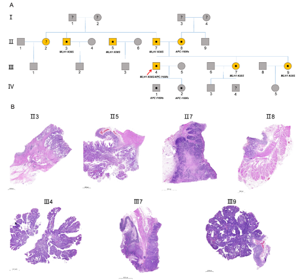 图1:一个结直肠癌家族的图谱和结直肠肿瘤的H&E染色。