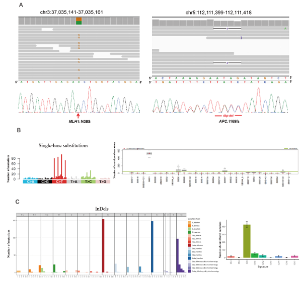 图2:全外显子组测序发现该家族一位结直肠癌患者同时携带APC 和MHL1基因胚系突变,并且解析了该患者结直肠癌体细胞突变的特征。