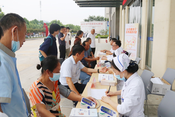 活动现场参与的群众熙来攘往,健康筛查内科由张誉、张樊、陈莉等专家坐诊,外科由专家王延超坐诊,骨科由彭新、冯玉峰等专家坐诊,健康管理中心的护理人员负责身高、体重、血压、血糖等检查项目,并为大家讲解了“三减三健”的健身知识,分发体检优惠券,号召居民积极参与全民健身活动和定期健康体检。