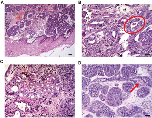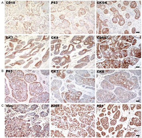 食管腺样囊性癌是一种罕见食管恶性肿瘤,容易被误诊为其它食管恶性肿瘤。近期中国科学院合肥肿瘤医院收治了一名从外院不能明确病理分型的转诊患者,科研人员通过对其组织病理病理特征进行了全面的研究,组织学检查显示病变组织呈管状、筛状、实型三种典型结构。免疫组化分析显示,肌上皮细胞标志物CD10和p63标记细胞位于管状和筛状模式的外层,而腺细胞标志物CK7和CK8阳性细胞则聚集在内层。随着病变组织形态由管状、筛状向实性发展,CK7、ck8标记的内细胞逐渐消失,而p63阳性细胞扩散至整个肿瘤肿块,同时伴随上皮向间质转化标记物波形蛋白染色增强。这些新的免疫组织化学特征结合经典的组织学模式,将可以给予食管腺样囊性癌精确诊断并提供靶向治疗靶标。