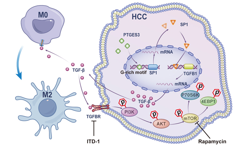 图:示意图显示PTGES3核内转录调控促进肝细胞癌增殖与免疫抑制的新机制